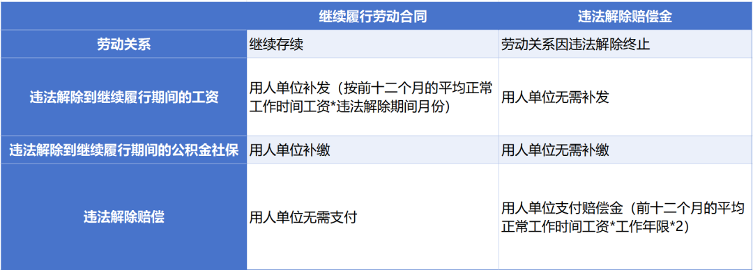 主张继续履行和赔偿金各有利弊,虽然继续履行具有优先性且可以获得违法解除期间的工资、社保以及恢复劳动关系,对可能长达一两年的劳动仲裁和诉讼过程来说,获得工资有可能高于赔偿金,但也需要劳动者在长期的诉讼和仲裁期间放弃入职其他单位,具有不确定性;而赔偿金虽然金额固定,但在违法解除且未继续履行劳动关系的情况下,赔偿金的仲裁或诉讼请求均会获得支持,且不影响劳动者在此期间入职其他用人单位。